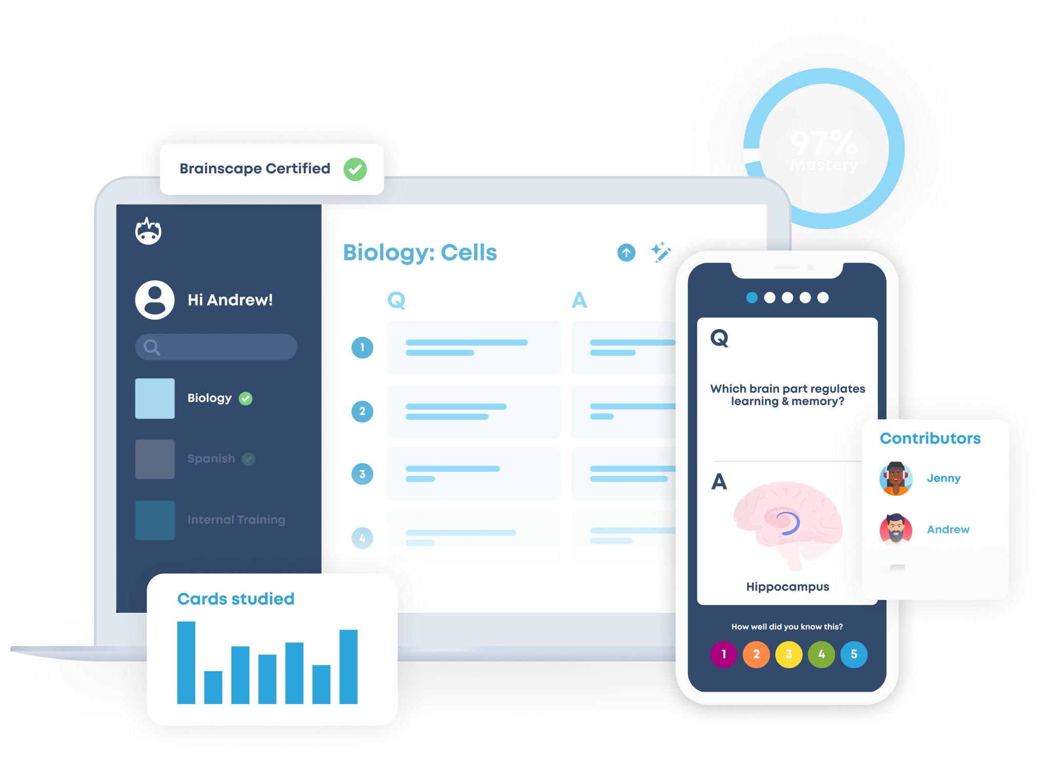 You can easily provide instructions or source materials (like a PPT, PDF, doc, etc) to Brainscape, and our AI will magically generate a comprehensive set of flashcards for you! Brainscape's flexible flashcard editor then allows you to modify, prune, or append the flashcards to your heart's content — including by adding images and sounds. All of your flashcards are made instantly available across all devices where you have a Brainscape account.